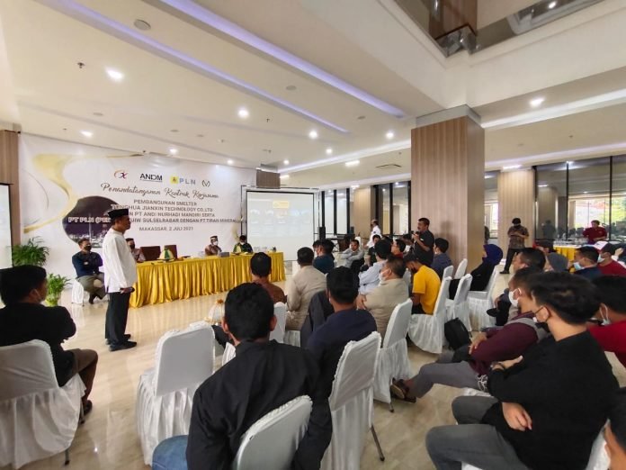 penandatanganan kontrak kerjasama pembangunan smelter antara Tonghua Jianxin Technology CO.LTD dengan PT Andi Nurhadi Mandiri serta PLN (Persero) UIW Sulserabar dengan PT Tiran Mineral, Jumat (2/07/2021).