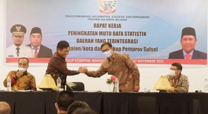 MAKASSAR, SULSELEKSPRES.COM – Kepala Dinas Komunikasi Informatika Statistik dan Persandian (Diskominfo SP) Provinsi Sulawesi Selatan Amson Padolo mewakili Plt. Gubernur Sulawesi Selatan membuka rapat kerja Peningkatan Mutu dan Statistik Daerah yang Terintegrasi Kabupaten/Kota dan Lingkup Pemprov Sulawesi Selatan Tahun 2021 di Hotel Golden Tulip Makassar, Sabtu (27/11).