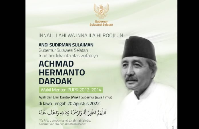 “Innalilahi Wa Innailaihi Rojiun. Atas nama pribadi dan keluarga menyampaikan rasa duka cita mendalam dan turut berbelasungkawa atas meninggalnya Bapak H. Achmad Hermanto Dardak, ayahanda dari Wakil Gubernur Jawa Timur Bapak Emil Elistianto Dardak kemarin,” kata Andi Sudirman Sulaiman.
