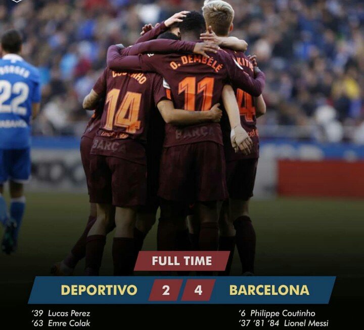 Kemenangan 4-2 memastikan gelar La Liga musim ini jatuh ke tangan Barcelona. Sebaliknya kekalahan memastikan Deportivo terdegradasi.