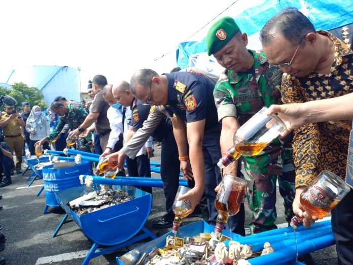 Adapun barang yang dimusnahkan berupa 1.347.200 batang rokok ilegal dan minuman mengandung etil alkohol (MMEA) 12.000 ml sebanyak 12 botol, senilai Rp1.520.918.000