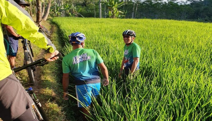 Saking semangatnya bersepeda sampai nyemplung ke sawah,” tulis Sandiaga.