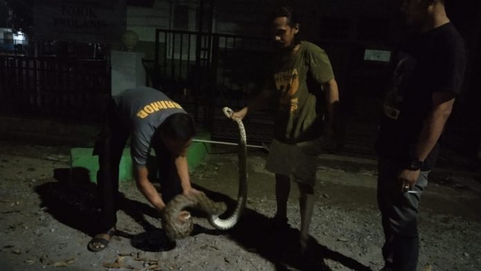 Ular yang muncul dari saluran pembuangan warga ini diperkirakan berasal dari aliran sungai yang tidak jauh dari lokasi.