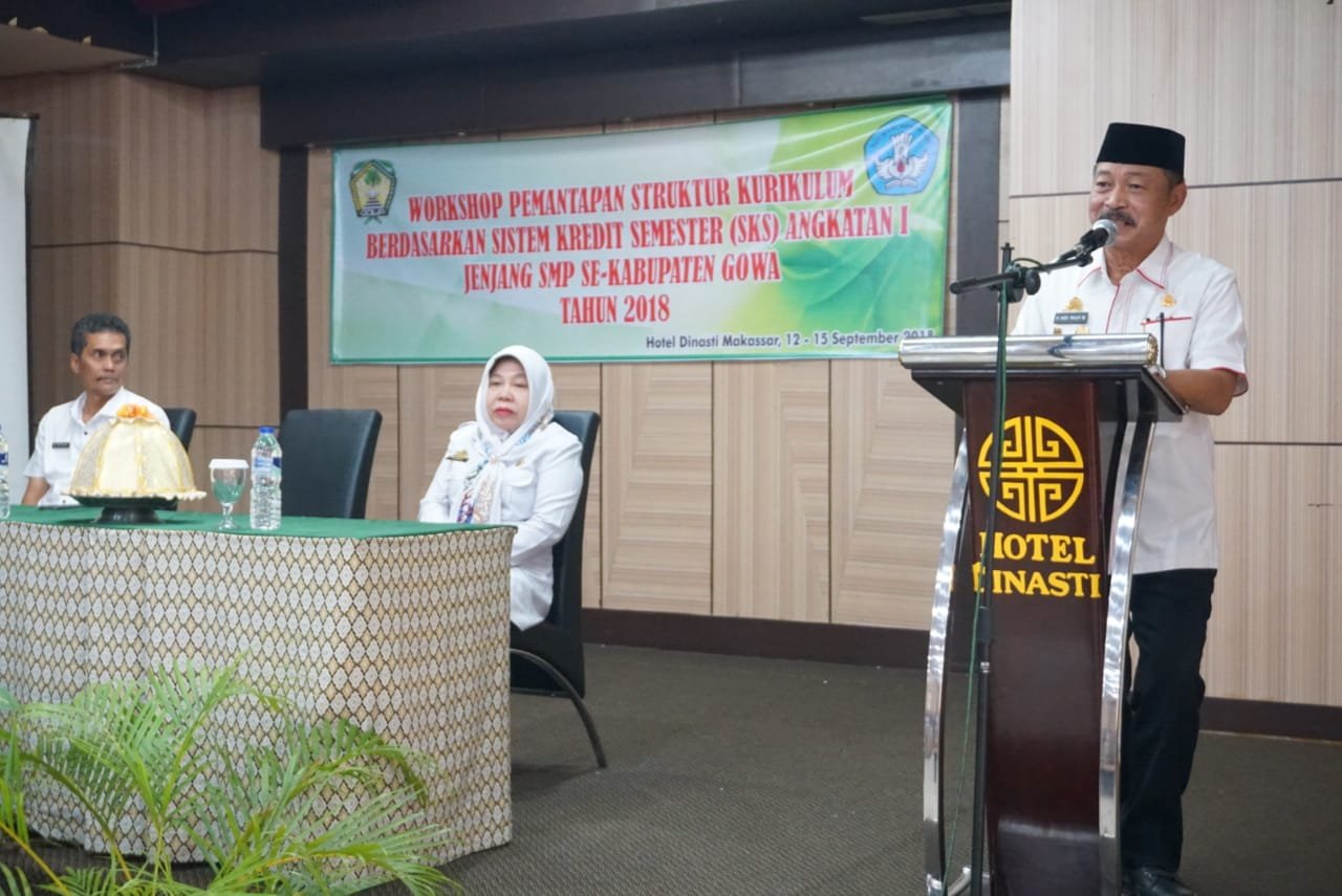 SUNGGUMINASA, SULSELEKSPRES.COM – Wakil Bupati Gowa, Abd Rauf Malaganni, secara resmi membuka Workshop Pemantapan Struktur Kurikulum Sistem Kredit Semester (SKS)angkatan I untuk jenjang Sekolah Menengah Pertama (SMP) tingkat Kabupaten Gowa, di Hotel Dinasty Makassar, Rabu (12/9/2018).