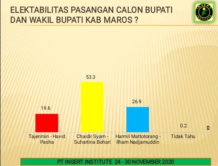 Sedangkan pasangan nomor urut 1, Tajerimin-Havid Pasha, hanya menguntit di posisi tiga dengan perolehan 19,6 persen. Sementara untuk persentase masyarakat yang tidak tahu atau tidak menjawab sebesar 0,2 persen.