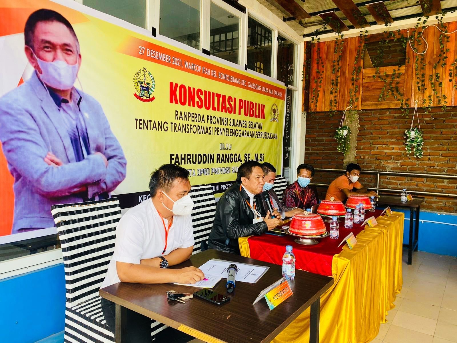SULSELEKSPRES.COM – Anggota DPRD Provinsi Sulsel, Fahruddin Rangga kembali melaksanakan kegiatan konsultasi publik terhadap rancangan propemperda transformasi penyelenggaraan perpustakaan di Keluraham Bontolempangan, Kecamatan Galesong Utara, Kabupaten Takalar, Senin (27/12/2021).