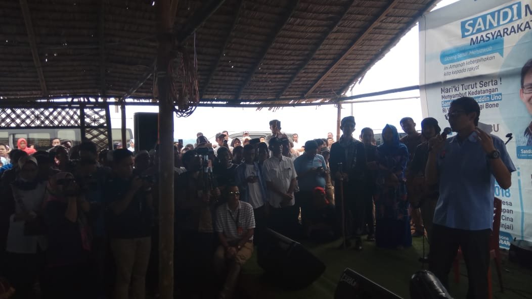 BONE, SULSELEKSPRES.COM – Calon Wakil Presiden nomor urut 02, Sandiaga Uno melakukan kunjungan di Dusun Allorongenge, Desa Tanete Harapan, Kecamatan Cina, sekitar 19 kilometer dari Kota Watampone, Rabu (26/12/2018).