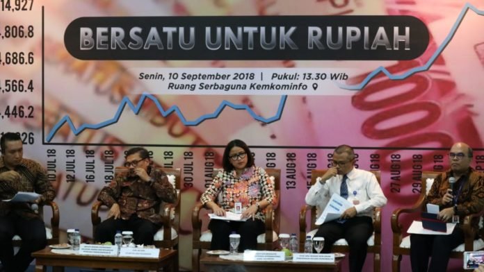 Forum Merdeka Barat 9 di Ruang Serbaguna Menkominfo hadir dengan bertemakan ‘Bersatu untuk Rupiah’ yang mendatangkan beberapa narasumber dari berbagai Lembaga Pemerintahan, Juru Bicara Otoritas Jasa Keuangan Sekar Putih Djarot, Deputi Bidang Koordinasi Ekonomi Makro dan Keuangan Kemenko Perekonomian RI Iskandar Simorangkir, Staf Ahli Bidang Kebijakan Peneriman Negara Kemenkeu RI Robert Leonard Marbun, serta Direktur Eksekutif Departemen Internasional Bank Indonesia Doddy Zulverdy, Senin (10/9/2018), dilansir dari situs resmi Istana.