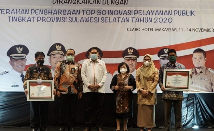 Penghargaan yang diserahkan Sekretaris Daerah Peovinsi Sulsel, Abdul Hayat Gani diterima para inovator didampingi Sekretaris Daerah Kota Parepare, Iwan Asaad di Hotel Claro, Kota Makassar, Kamis, (12/11/2020).