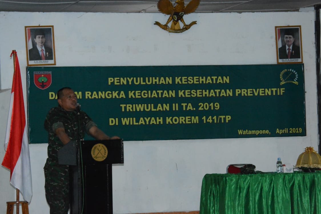 BONE,SULSELEKSPRES.COM – Korem 141/Tp melakukan giat penyuluhan kesehatan. Giat ini dalam rangka kegiatan kesehatan preventif triwulan II bagi personil dijajaran wilayah Korem 141 Toddopuli, bertempat Di Aula Sudirman Jln Jendral Sudirm Watampone. Senin, (22/04/2019).