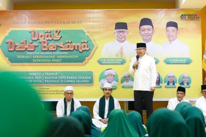 Doa dan Dzikir Golkar Sulsel yang terhubung secara daring dengan peringatan nasional yang dibuka Ketua Umum Bahlil Lahadalia dan dihadiri Presiden Prabowo Subianto serta Wakil Presiden Gibran Rakabuming Raka.