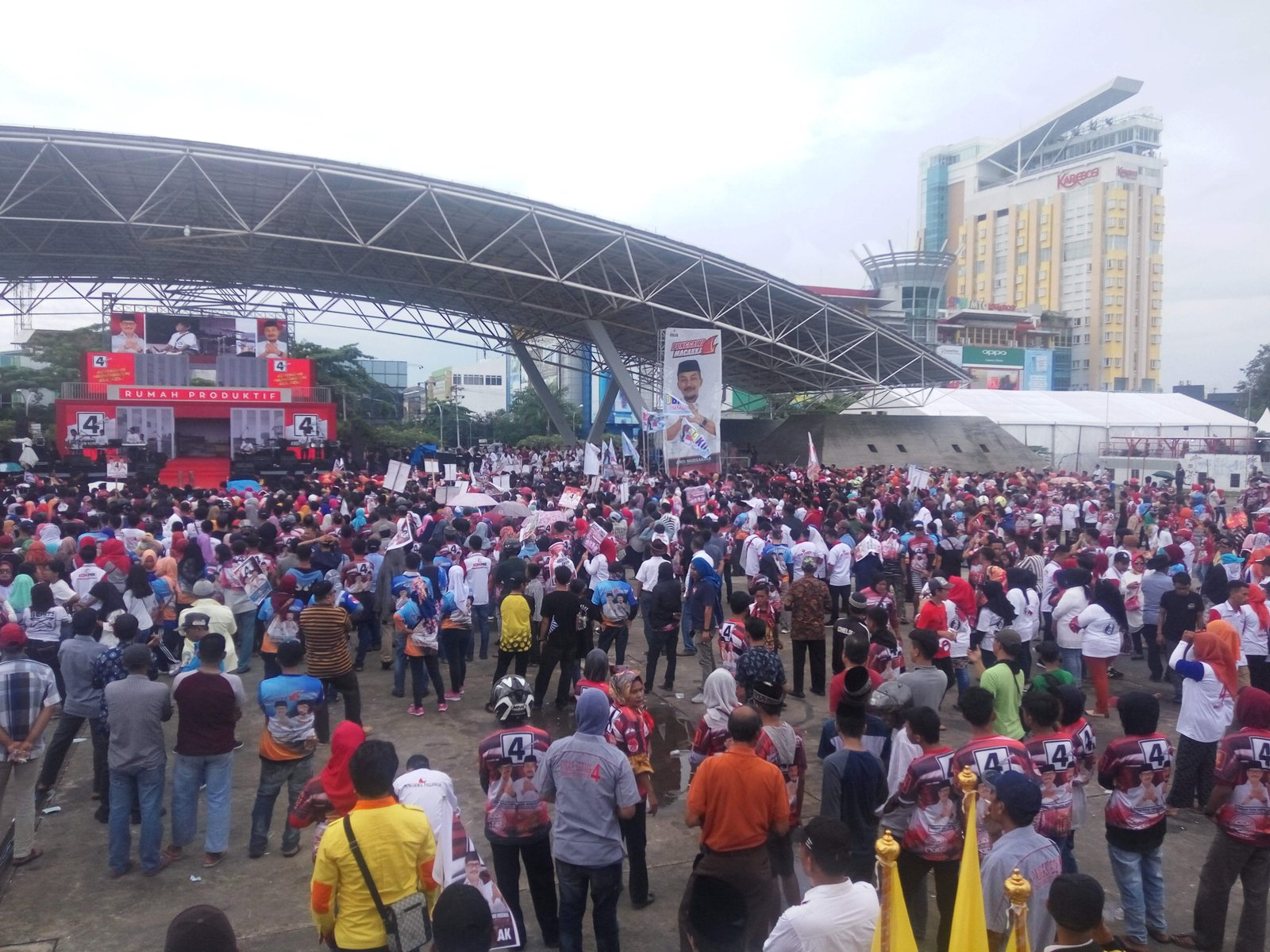 Hujan yang sempat mengguyur di sekitar lokasi kampanye bahkan tak menghambat massa terus berdatangan dari berbagai penjuru Makassar ke Lapangan Karebosi. Apalagi saat kampanye dibuka dengan penampilan dari Fanny KDI. Massa pun ikut bergoyang.