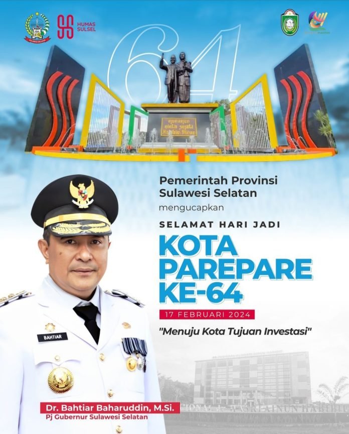 PAREPARE, SULSELEKSPRES.COM – Penjabat Gubernur Sulawesi Selatan, Bahtiar Baharuddin menyampaikan ucapan selamat hari ulang tahun ke-64 Kota Parepare, Sabtu (17/2/2024).