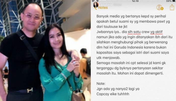 “Jika ada yang ingin ditanyakan lebih dari itu, silakan menghubungi pihak yang berwenang, dalam hal ini Garuda. Karena bukan kapasitas saya sebagai istri dari suami saya untuk menjawab,” katanya.
