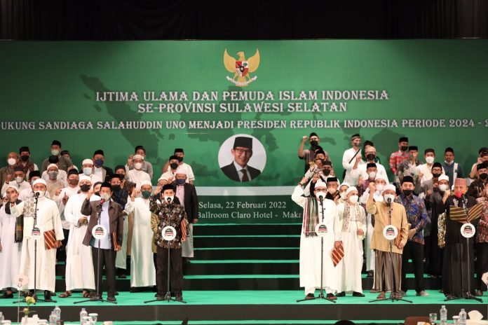 MAKASSAR, SULSELEKSPRES.COM – Sejumlah ulama, habib, dan Pemuda Islam Indonesia (PII) di Sulawesi Selatan (Sulsel) yang tergabung dalam Ijtima Ulama mendeklarasikan dukungan kepada Menteri Pariwisata dan Ekonomi Kreatif (Menparekraf) Sandiaga Uno, untuk maju sebagai Calon Presiden (Capres) 2024.