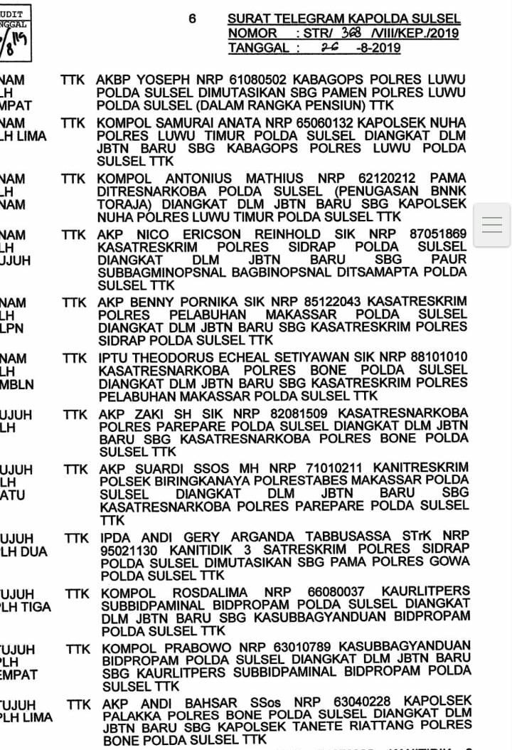 Adanya informasi beredar kedua perwira ditubuh Kepolisian Resort (Polres) Bone berdasarkan surat Telegram Kapolda Sulsel Nomor: STR/368/VIII/KEP./2019 tanggal 26, Agustus 2019 ditandatangani langsung oleh Karo SDM Polda Sulsel, Kombes Pol Yohanes Ragil (AN Kapolda Sulsel).