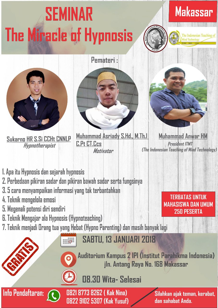 MAKASSAR, SULSELEKSPRES.COM – The Indonesia Teaching of Mind Technology (ITMT) dan The Indonesia Brief Convensational Hypnoterapy (IBCH) akan mengadakan seminar bertema “The Miracle of Hypnosis”.