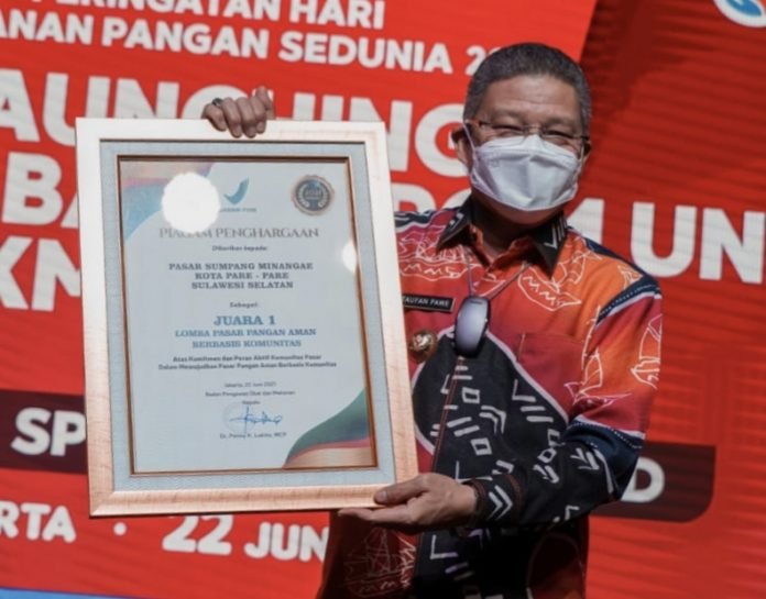 Penghargaan yang diserahkan oleh Menteri Koperasi dan UKM, Teten Masduki didampingi Kepala Badan Pengawas Obat dan Makanan (BPOM) RI, Penny K Lukito, MCP diterima oleh Wali Kota Parepare, Taufan Pawe, di Jakarta, Selasa, (22/06/2021).