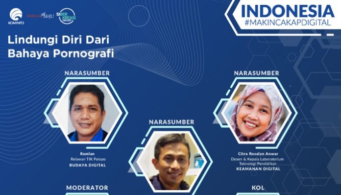 SULSELEKSPRES.COM – Rangkaian Program Literasi Digital “Indonesia Makin Cakap Digital” di Sulawesi yang diselenggarakan oleh Kementerian Komunikasi dan Informatika Republik Indonesia dan Siberkreasi bersama Dyandra Promosindo, dilaksanakan secara virtual pada 5 Agustus 2021 di Makassar, Sulawesi Selatan. Kolaborasi ketiga lembaga ini dikhususkan pada penyelenggaraan Program Literasi Digital di wilayah Sulawesi. Adapun tema kali adalah “Lindungi Diri dari Bahaya Pornografi”.