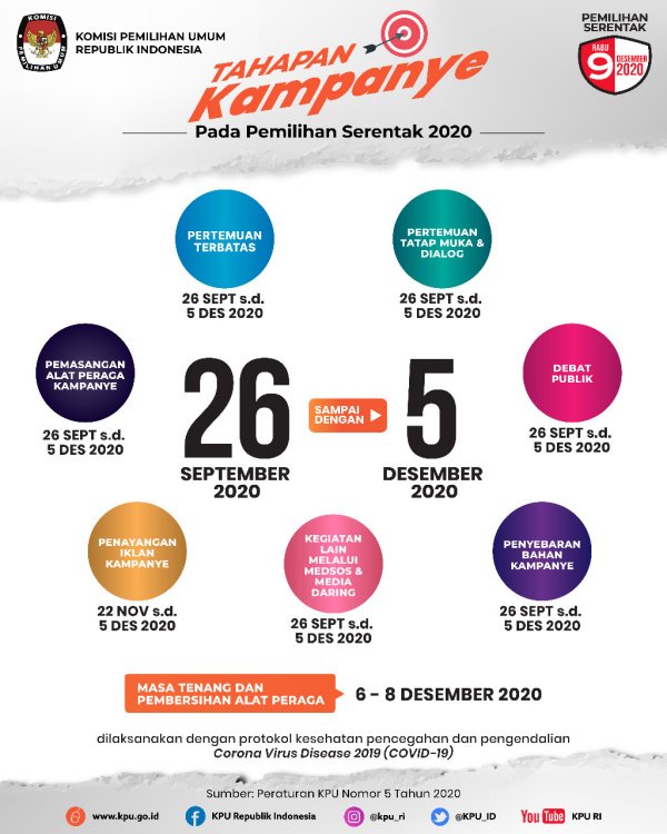 Untuk menggelar pertemuan terbatas, pertemuan tatap muka dan dialog, penyebaran bahan kampanye, pemasangan APK, kegiatan lain melalui medsos dan media daring, serta debat publik, dijadwalkan berlangsung dalam rentang waktu tanggal (26/9/2020) sampai pada tanggal (5/12/2020).