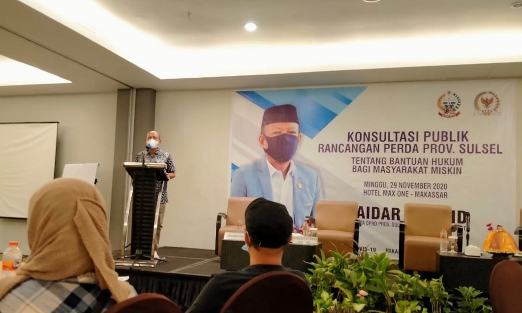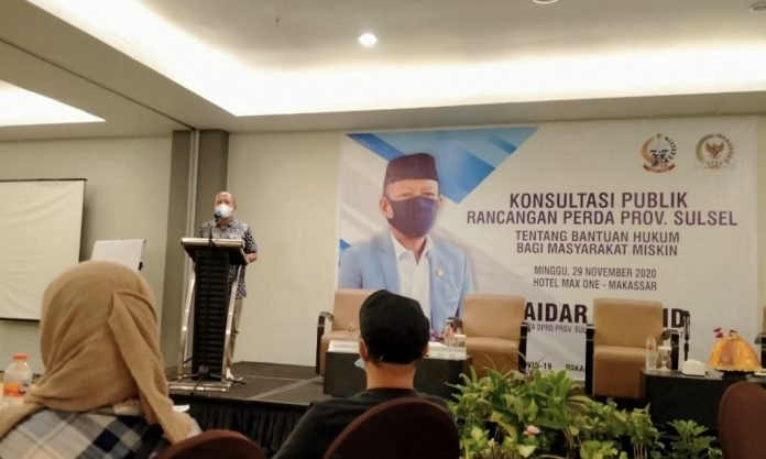 MAKASSAR, SULSELEKSPRES.COM – Anggota Komisi E DPRD Sulawesi Selatan, Haidar Madjid menggelar konsultasi publik tentang ranperda bantuan hukum bagi masyarakat miskin. Kegiatan itu digelar di Hotel Max One, Jalan Taman Makam Pahlawan, Ahad 29 November 2020.