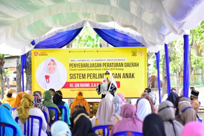 MAKASSAR, SULSELEKSPRES.COM – Anggota DPRD Provinsi Sulawesi Selatan, Hj Sri Rahmi, S.A.P, M.Adm.K.P, mengadakan kegiatan Penyebarluasan Peraturan Daerah (Perda) Provinsi Sulawesi Selatan Nomor 4 Tahun 2013 tentang Sistem Perlindungan Anak, di dua lokasi berbeda di Makassar, pada Minggu, 15 November 2020.