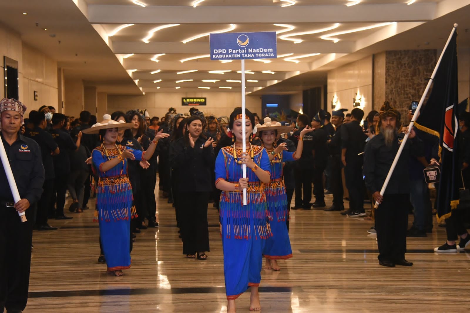 Didominasi warna biru kebesaran NasDem, busana yang dikenakan peserta dari 24 kabupaten kota ini memadukan ciri khas dari daerahnya masing-masing.