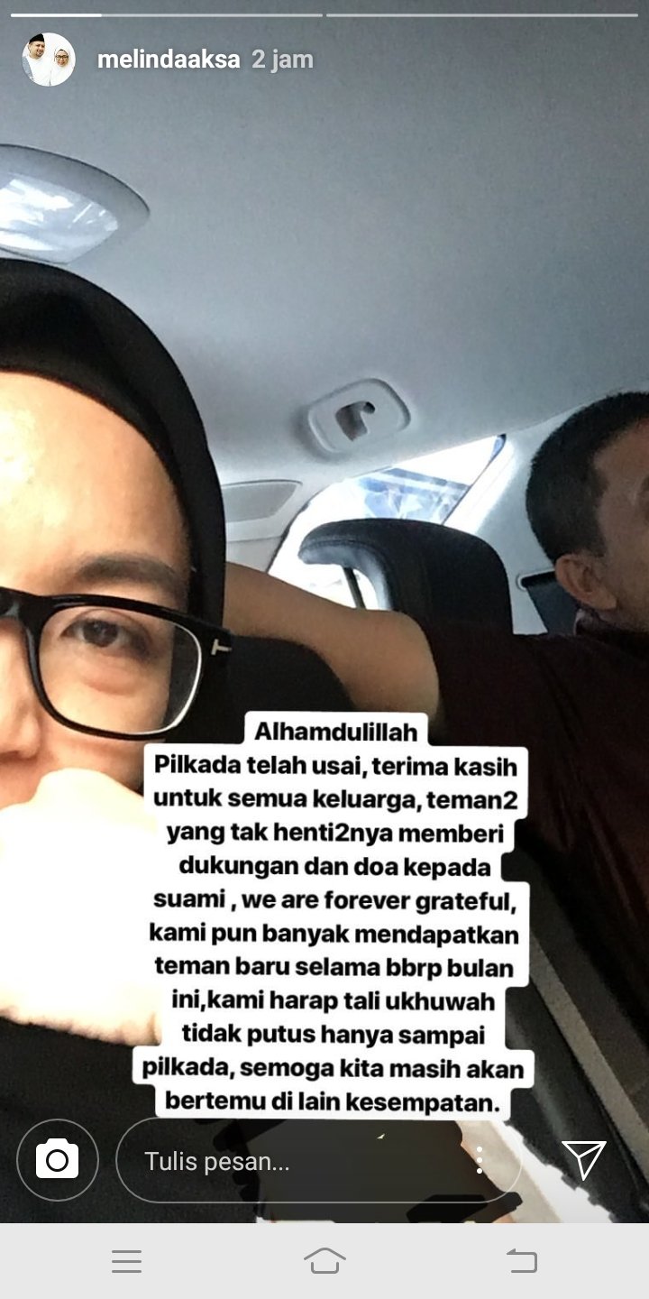 Melalui instastory akun instagram pribadinya @melindaaksa, Melinda mengucap syukur akan pelaksanaan Pilkada yang telah usai. Termasuk ucapan terima kasih atas dukungan dan terhadap suaminya, Appi yang di Pilwali Makassar berpasangan dengan Rahmatika Dewi.