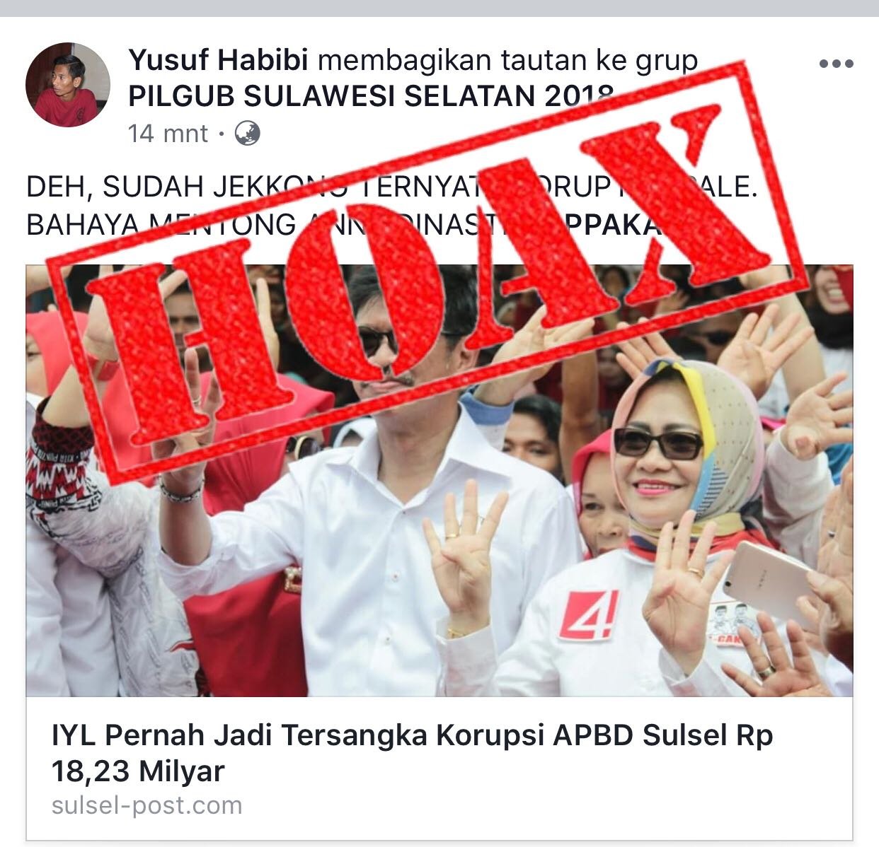 Parahnya, memunculkan komentar Kapolda di tahun 2004 yang pernyataannya sama sekali tidak ada menyebut nama Ichsan Yasin Limpo. Berita hoaks yang dimunculkan tersebut dibagi ke media sosial, termasuk dibagikan ke sejumlah group whatsapp.