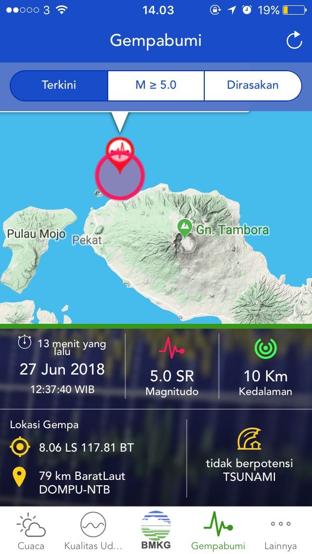 DOMPU, SULSELEKSPRES.COM – Gempa Bumi dengan kekuatan 5 Skala Richter baru saja mengguncang wilayah Barat Laut, Kabupaten Dompu, Nusa Tenggara Barat (NTB). Rabu (27/6/2018).