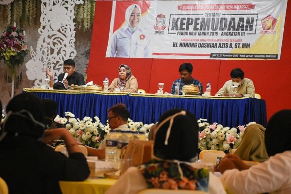 MAKASSAR, SULSELEKSPRES.COM – Anggota DPRD Kota Makassar, Nunung Dasniar, melaksanakan tatap muka dalam agenda sosialisasi penyebarluasan informasi dan produk hukum terkait Perda nomor 6 tahun 2019 tentang Kepemudaan, di Hotel Sarison, Jumat (27/11/2020).