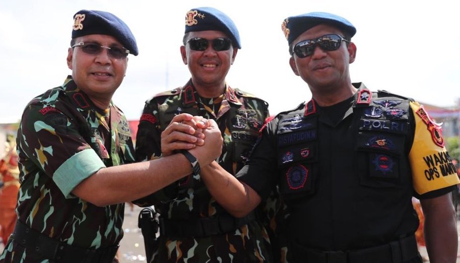 Keduanya mengenakan serangam lengkap loreng khas Brimob. Upacara dipimpin Kapolda Sulsel Irjen Pol Umar Septono.
