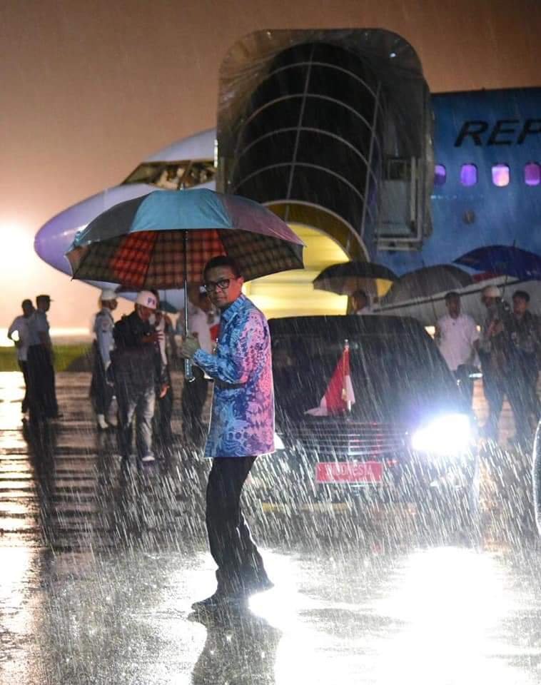 Keduanya, nampak tampil mandiri saat momen yang berbeda. Diketahui, Prof HM Nurdin Abdullah memakai payung tersebut saat menjemput Presiden Republik Indonesia Joko Widodo dengan Wakil Presiden Republik Indonesia Jusuf Kalla di Bandara Galaktika TNI- AU.