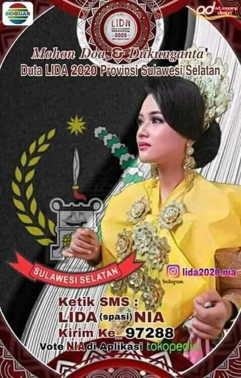 “Nia Lida membawa nama baik daerah Kita di tingkat nasional. Untuk itu, mari mendukung perjuangannya dengan cara: Ketik Lida (Spasi) Nia kirim SMS ke 97288 atau vote melalui Aplikasi Vidio,” jelas Nurdin Abdullah.