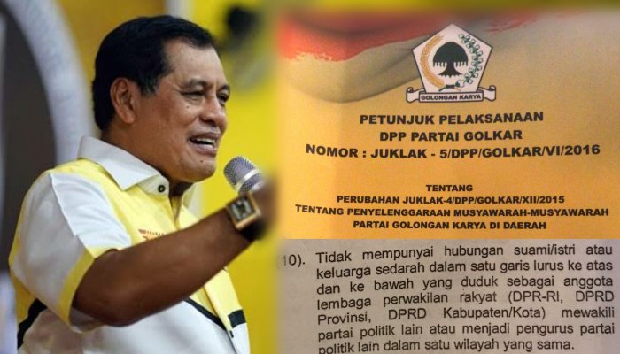 Dimana dalam juklak tahun 2016 ini mensyaratkan calon ketua tidak boleh memiliki keluarga sebagai anggota DPR atau pengurus dari partai lain. Sementara Nurdin Halid diketahui memiliki adik, yang tercatat sebagai kader PKB.