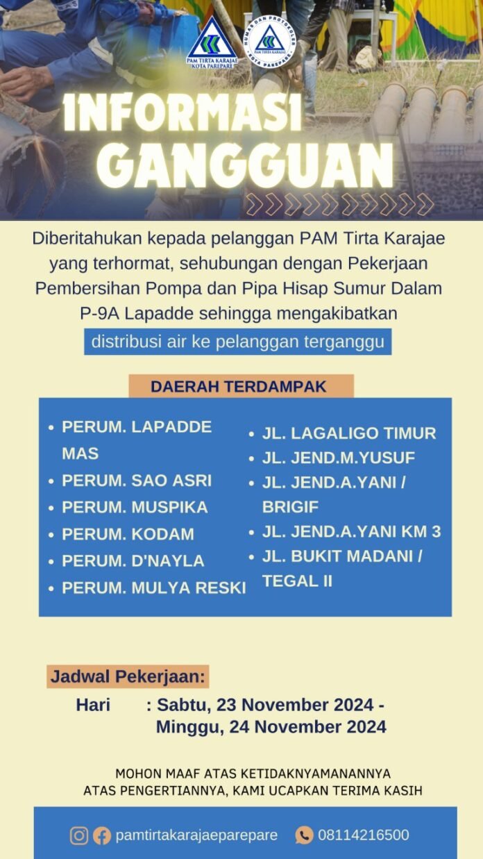 Gangguan ini disebabkan oleh pekerjaan pembersihan pompa dan pipa hisap Sumur Dalam P-9A Lapadde, yang direncanakan pada Sabtu-Minggu, 23-24 November 2024.