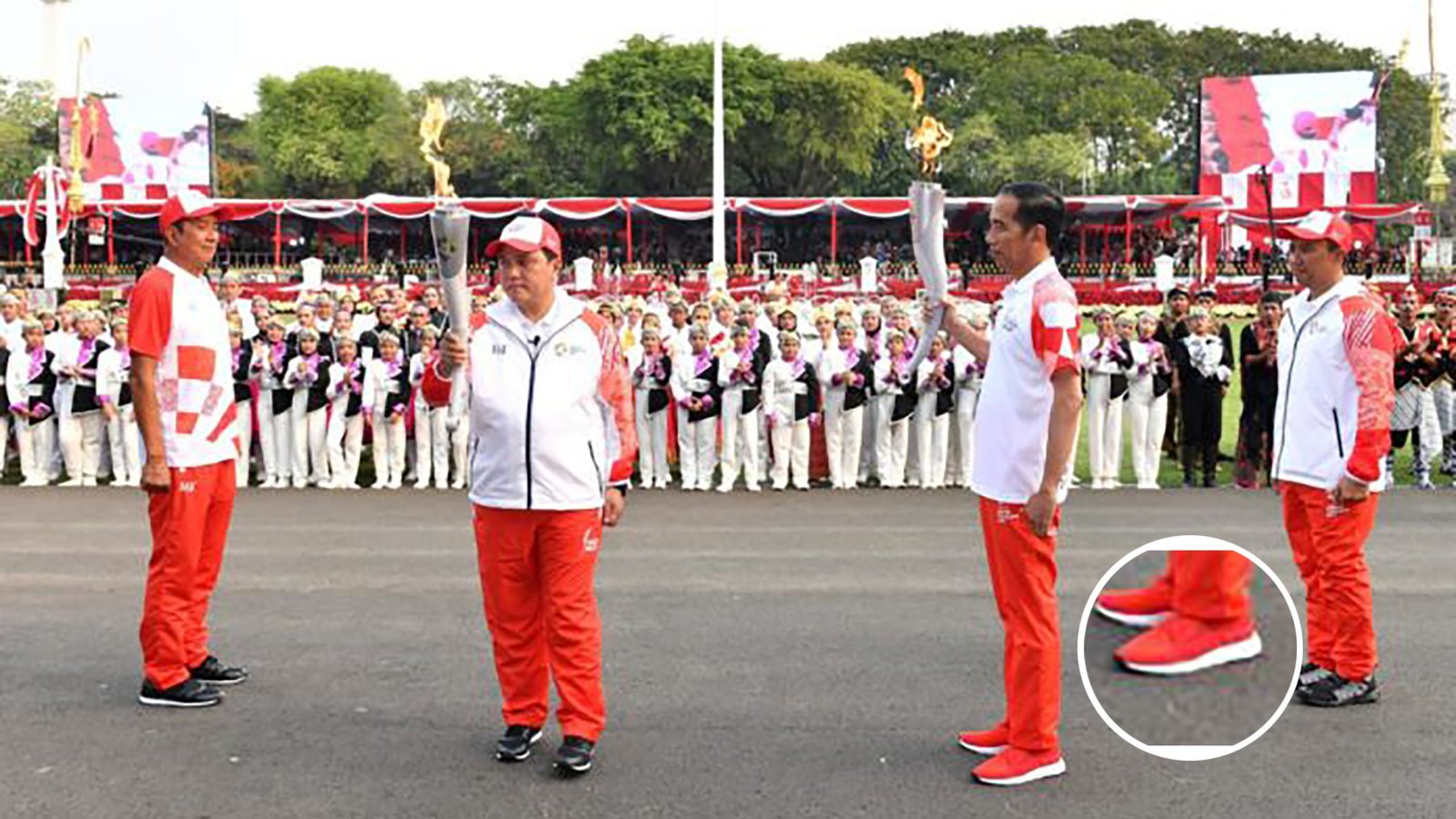 Sementara saat upacara pembukaan, dengan mengenakan sneakers tersebut, Jokowi bersama para atlet legendaris berlari kecil dengan membawa obor menuju tangga depan Istana Merdeka di mana Ketua INASGOC, Erick Thohir membawa obor Asian Games 2018.