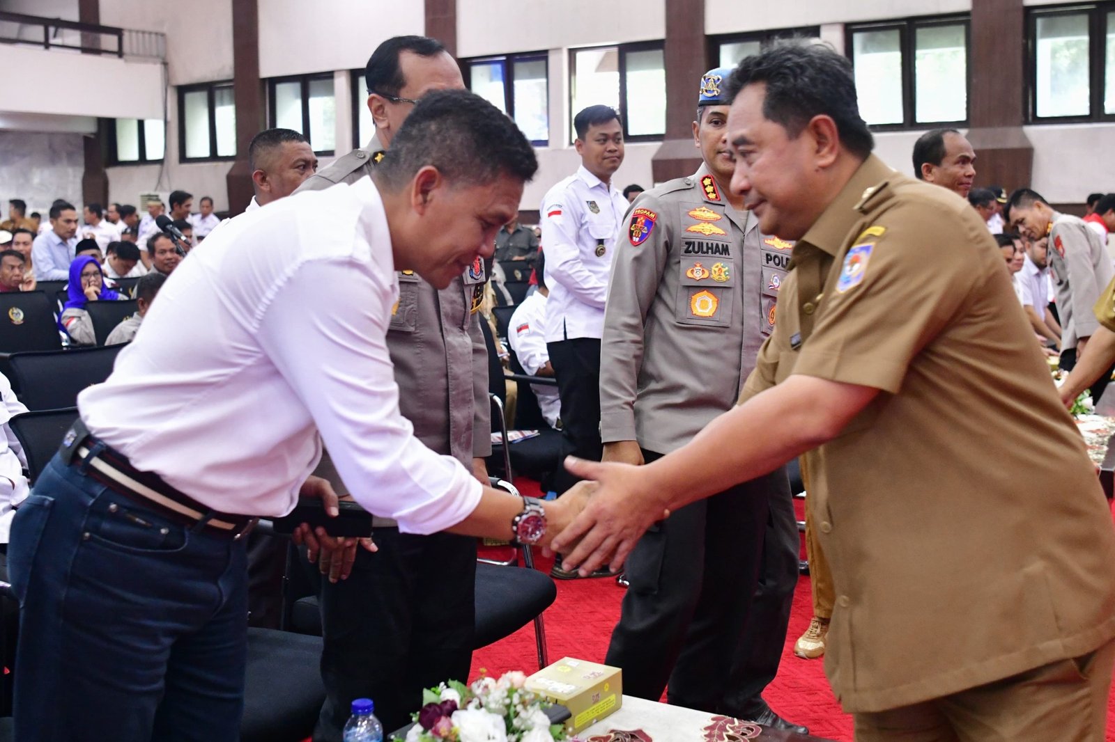 “Sebenarnya saya malu berdiri di sini Pak, karena pernah itu hari kita demo-demo Pak Gubernur. Sekarang kita bersilaturahmi, olehnya pada kesempatan yang berbahagia ini saya ingin menyampaikan kepada teman-teman, kita mendukung visi misi Bapak Gubernur,” ujarnya.