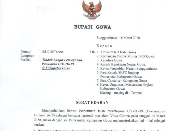 SUNGGUMINASA,SULSELEKSPRES.COM – Guna mengantisipasi penyebaran virus corona atau Covid-19 di wilayah Kabupaten Gowa, Bupati Gowa Adnan Purichta Ichsan mengeluarkan surat edaran tertanggal Senin, 16 Maret 2020 dengan nomor 188/010/Tapem dengan perihal Tindak lanjut Pencegahan Penularan Covid-19 di Kabupaten Gowa.