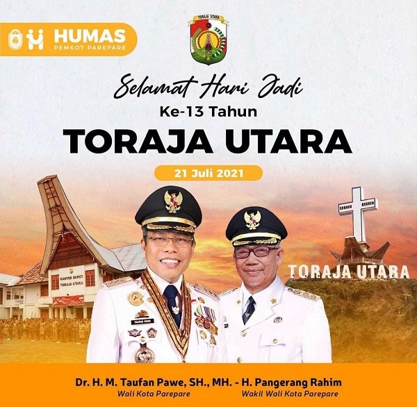 PAREPARE, SULSELEKSPRES.COM – Pemerintah Kota Parepare memberi ucapan Hari Ulang Tahun (HUT) yang ke-13 untuk Pemerintah Kabupaten Toraja Utara.