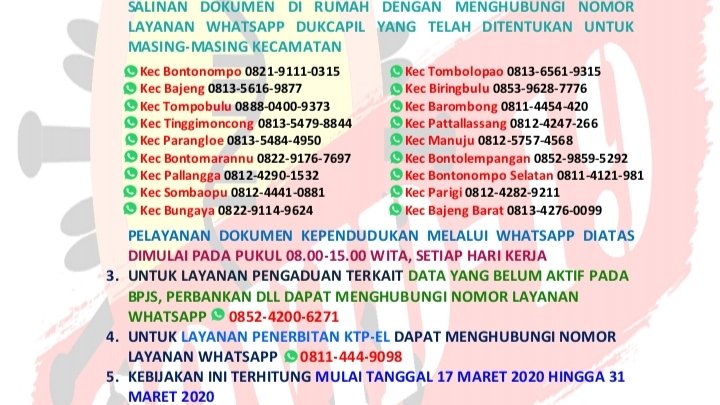 Layanan pengurusan dokumen kependudukan melalui akun Whatsapp ini diperuntukkan untuk pengurusan yang sifatnya sangat dibutuhkan dan mendesak. Sedangkan, untuk yang sifatnya tidak urgent dan mendesak Disdukcapil Gowa mengimbau agar masyarakat menunda dan mengurus kembali pada awal April 2020 .