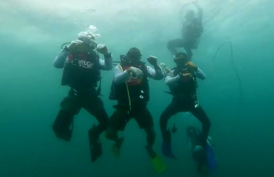 Terlihat, walaupun sedang di dalam air, para penyelam ini setelah melaksanakan penurunan dan pemasangan media Garuda di Lautku pada tempatnya, mereka berjoget dengan santainya seolah-olah bukan berada di dalam air.