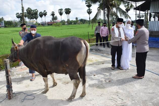 “Pandemi membuat kita harus jaga jarak secara fisik, namun bathin selalu dekat, hari raya Idul Adha adalah momentum untuk saling lebih dekat lagi melalui kegiatan berbagi kepada sesama personel, masyarakat sekitar kita, dan lebih khusus kepada kaum duafa melalui pembagian daging hewan kurban, semoga amal ibadah kita diterima disisiNya,” ucap AKBP Try Handako dalam keterangannya.