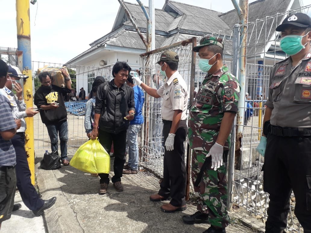 Barru-Rabu (25/03/2020). Langkah ini merupakan pencegahan penyebaran virus Corona (Covid-19), Pos TNI AL (Posal) Barru bekerja sama dengan pihak intansi TNI/POLRI dan Pemerintahan setempat mengadakan pemeriksaan kesehatan terhadap para pengguna transportasi laut dengan KM Awu-awu di pelabuhan Garongkong, Kabupaten Barru, Sulawesi Selatan.