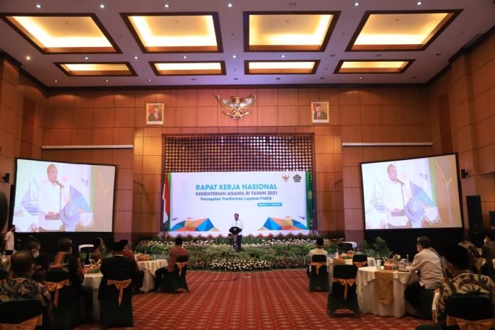 SULSELEKSPRES.COM – Kementerian Agama (Kemenag) menggelar Rapat Kerja Nasional (Rakernas) 2021. Kegiatan yang mengangkat tema Percepatan Transformasi Layanan Publik ini digelar secara luring dan daring, mulai Senin-Rabu (5 – 7 April 2021).