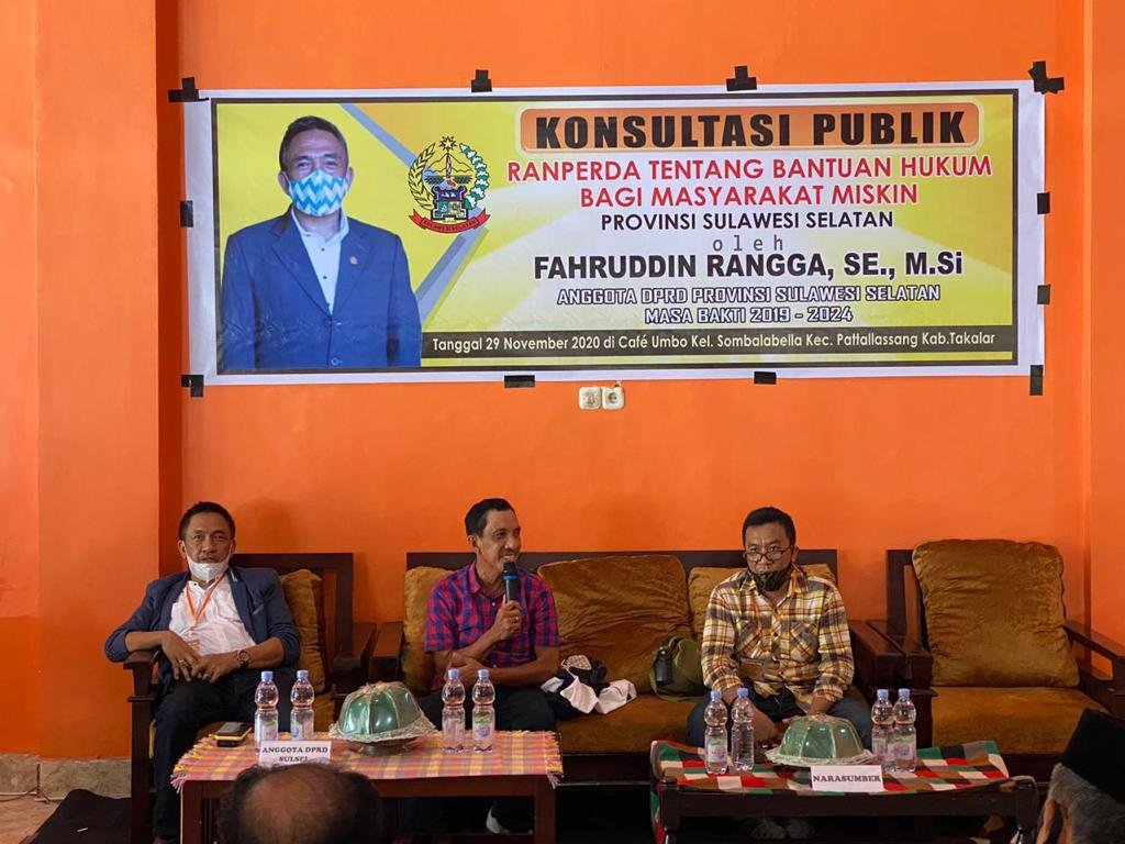 Fahruddin Rangga, dalam kesempatan tersebut mengatakan agenda kerja konsultasi publik ranperda tentang bantuan hukum bagi masyarakat miskin bertujuan untuk menjamin dan memenuhi hak bagi penerima bantuan hukum untuk mendapatkan akses keadilan.