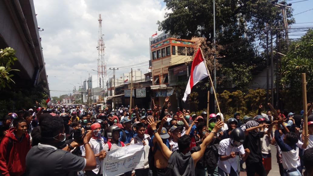 Sebelum mengepung gedung DPRD, sebagian siswa sempat mampir di bawah Fly Over dan bergabung dengan massa mahasiswa yang melakukan aksi, sembari menunggu reka-rekannya.