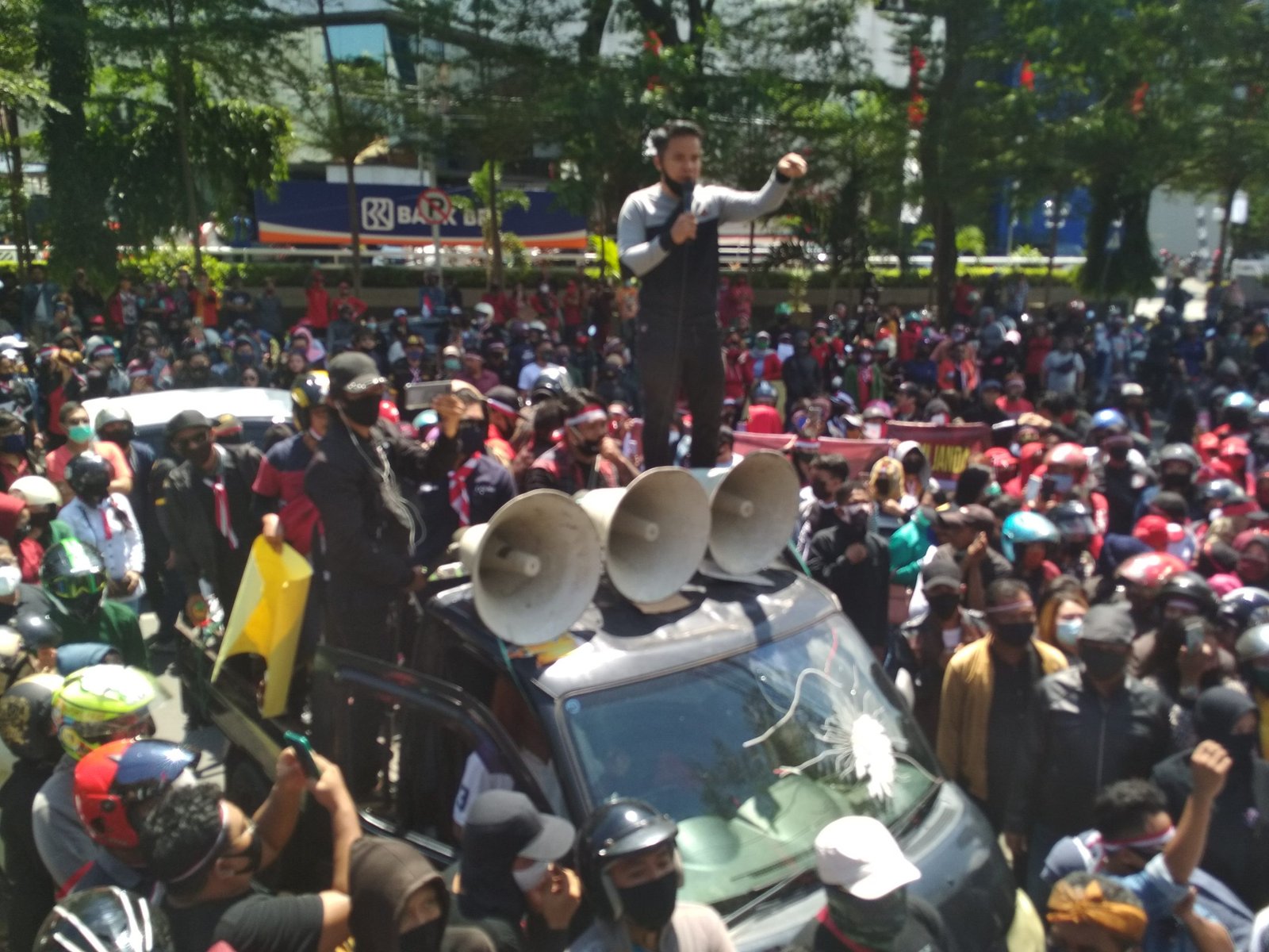MAKASSAR, SULSELEKSPRES.COM – Ribuan massa aksi dari kalangan pekerja industri pariwisata menyambangi kantor wali kota Makassar, untuk melakukan aksi demonstrasi, Kamis (13/8/2020) siang.