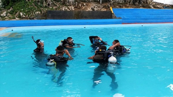 Dalam kesempatan tersebut, Puluhan Tim SAR Yon C Pelopor bekerjasama dengan Politeknik Kelautan dan Perikanan Bone kembali lakukan latihan menyelam di Kolam Renang Tanjung Pallette, Senin (20/07/2020).