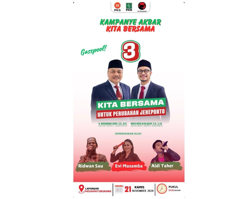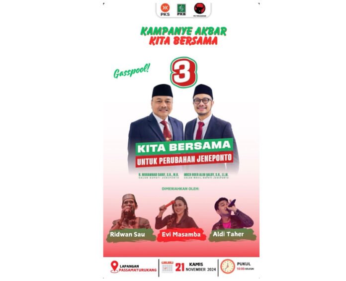JENEPONTO, SULSELEKSPRES.COM – Pasangan calon bupati dan wakil bupati Jeneponto nomor urut 3, Muhammad Sarif – Moch Noer Alim Qalby (Sarif-Qalby) mengundang seluruh warga Jeneponto untuk menghadiri kampanye akbar yang akan berlangsung di Lapangan Passamaturukang, Kamis, November 2024.
